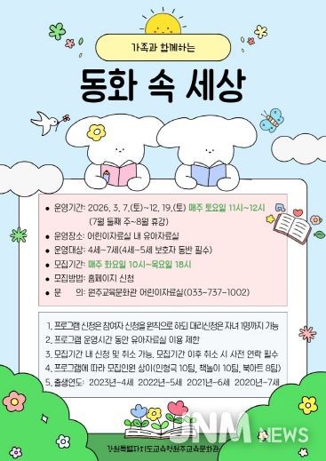 제이앤엠뉴스 | 원주교육문화관은 유아들이 책과 자연스럽게 친해지고, 가정 내 독서 문화를 형성할 수 있도록 유아와 가족을 대상으로 한 독서프로그램 가족과 함께하는 ‘동화 속 세상’을 운영한다.
