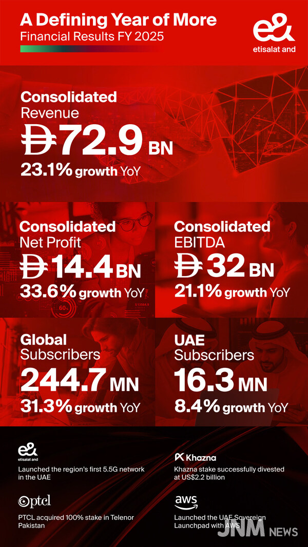 아부다비, 아랍에미리트, 2026년 2월 25일 -- 이앤드(e&)가 2025년 사상 최대 실적을 달성하며 전년 대비 23.1% 증가한 수치인 연결 매출 729억 디르함을 기록했다고 발표했다.