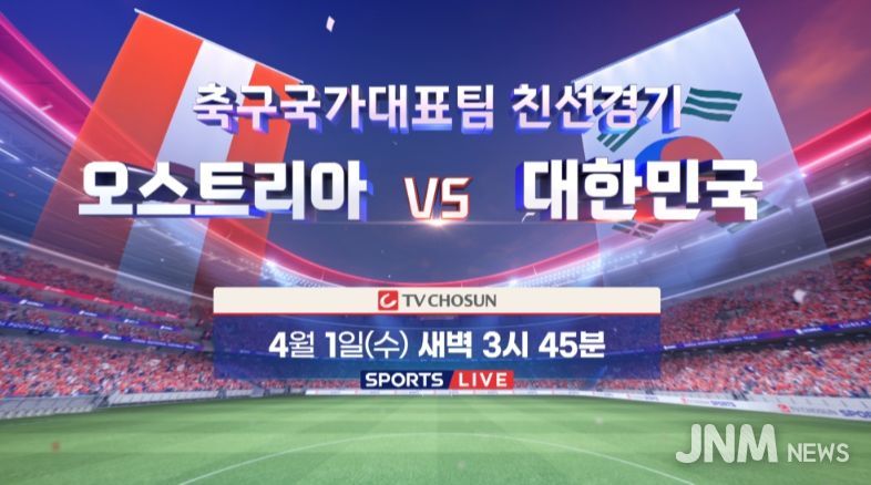 제이앤엠뉴스 | TV CHOSUN이 4월 1일(수) 새벽 3시 45분부터 오스트리아 빈 에른스트 하펠 스타디온에서 열리는 대한민국과 오스트리아의 축구 국가대표팀 친선경기를 생중계한다.