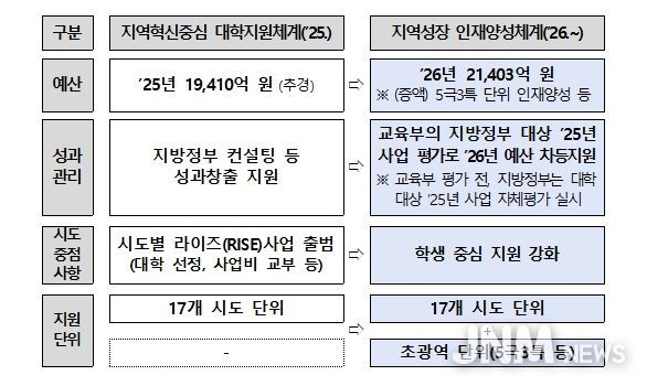 이 체계는 17개 지방정부가 각 지역의 발전 전략에 맞춘 맞춤형 사업을 통해 대학을 직접 육성하도록 하는 것이 핵심이다. 당초 2025년부터 '지역혁신중심 대학지원체계(라이즈, RISE)'로 운영돼 왔으나, 지역 인재의 정주와 균형 발전을 강조하는 방향으로 명칭이 변경됐다.