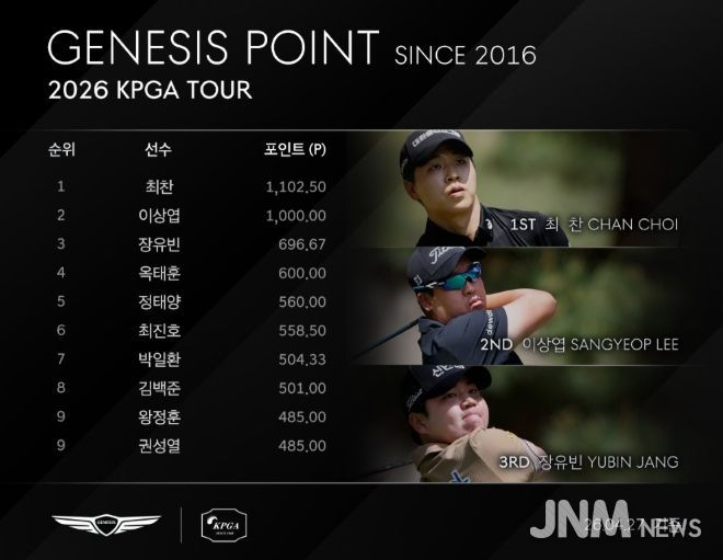 제이앤엠뉴스 | 최찬(29·대원플러스그룹)이 ‘2026 우리금융챔피언십’에서 우승을 차지하며 KPGA 투어 첫 승과 함께 제네시스 포인트 1위에 올랐다.