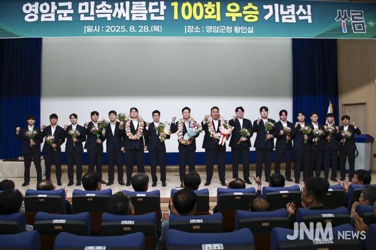 제이앤엠뉴스 | 영암군이 28일 군청에서 영암군민, 영암민속씨름단후원회원 등 300여 명이 참석한 가운데 ‘영암군민속씨름단 통산 100회 우승 달성 기념식’을 개최했다.