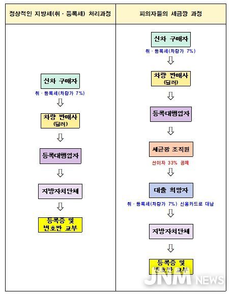 피의자들은, 경제적으로 어려운 상황에 있는 서민들도 대부분 신용카드는 가지고 있다는 점을 이용, 광고를 보고 연락한 사람들에게 금융업체 직원인 것처럼 소개하며 신용카드 정보만 있으면 복잡한 서류 작성이나 절차 없이 소액 대출을 해주는 것처럼 안내했고, 미리 수집해둔 제3자의 자동차 취·등록세 납부 정보를 통해 ‘세금깡’을 하고 급전이 필요한 자에게 선이자를 공제한 돈을 융통해주는 방식으로 범행을 지속해왔다.