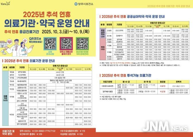 시는 연휴 기간 동안 의료 공백을 줄이기 위해 24시간 진료가 가능한 당직의료기관인 양주예쓰병원을 비롯해, 일자별로 지정된 병의원과 약국을 운영한다.