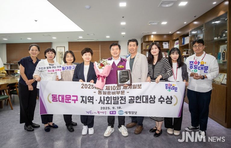제이앤엠뉴스 | 서울 동대문구는 ‘통일준비 도시’의 모범사례로 인정받았다. 구는 지난 18일 열린'제10회 세계일보 지역·사회발전 공헌대상'시상식에서 ‘통일준비 부문’ 수상의 영예를 안았다. 이번 수상은 전국 기초자치단체 가운데 유일한 통일 분야 수상 사례다.