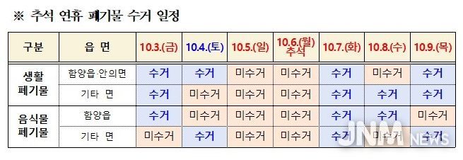 생활 쓰레기 수거 일정은 ▲3일 전 읍면 ▲4일 함양읍·안의면 ▲7일 전 읍면 ▲8일 함양읍·안의면 외 기타 면 ▲9일 전 읍면에서 정상 수거한다.