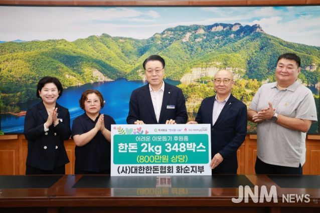 제이앤엠뉴스 | 화순군은 지난 24일 추석 명절을 맞이하여 대한한돈협회 화순지부(지부장 박용완)에서 800만 원 상당의 한돈(2kg) 348박스를 기부했다고 밝혔다.