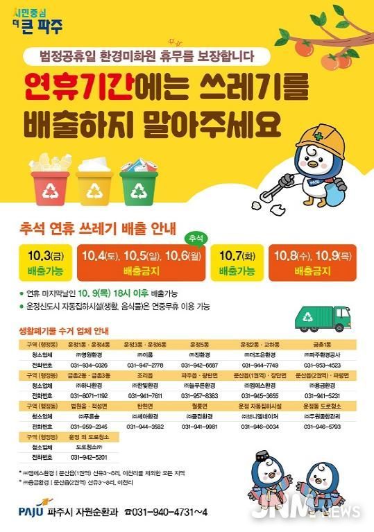 제이앤엠뉴스 | 파주시는 환경미화원 휴무 보장을 위해 추석 연휴 기간인 10월 4일부터 10월 6일, 10월 8일부터 10월 9일까지는 생활폐기물을 배출해서는 안 되며, 이 기간 동안에는 생활쓰레기 수거가 중단된다고 밝혔다.