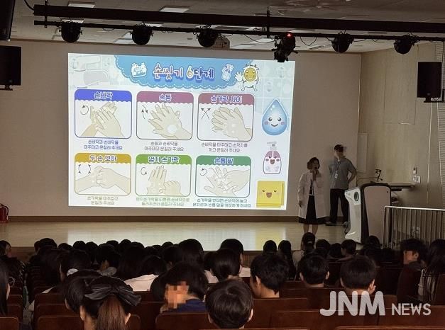 이번 교육의 주요 내용은 ▲올바른 손 씻기, ▲기침 예절, ▲감염병 전파 과정의 이해, ▲수두·유행성이하선염의 증상 및 예방법, ▲진드기와 모기로 전파되는 감염병 예방법 등으로 구성됐으며, 학생들이 쉽게 걸릴 수 있는 감염병을 알려주고 감염병 예방의 기본 수칙을 강조했다.