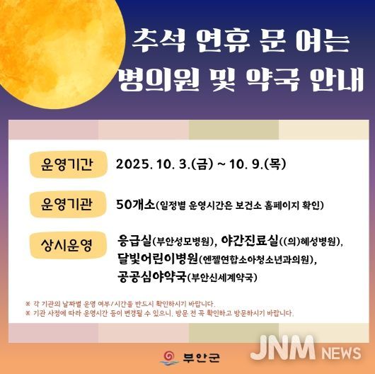 특히 지역응급의료기관인 부안성모병원은 24시간 응급실을 운영하여 응급환자 발생에 대비하고, 그 외 지정된 운영일에 병·의원, 약국 및 부안군보건소 역시 연휴 기간 중 차질 없는 의료 서비스를 제공할 예정이다.