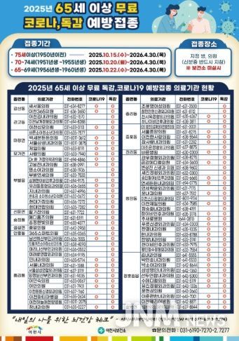 보건소 관계자는 “인플루엔자와 코로나19는 해마다 유행하는 바이러스가 달라지기 때문에 매년 접종이 필요하며 특히 65세 이상 어르신은 중증질환으로 진행될 위험이 크니 백신 접종으로 면역력을 높이길 바란다”라고 당부했다.