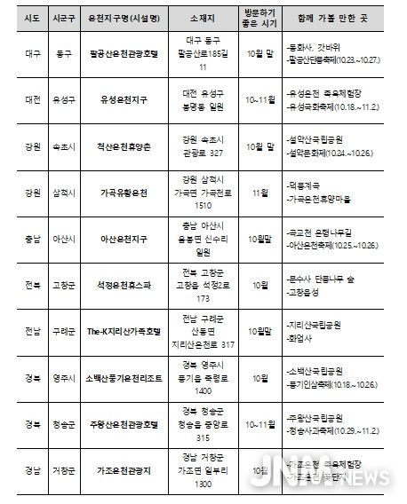 선정된 10곳은 ▲가을 정취를 한껏 느낄 수 있는 단풍명소 인근 온천 8곳과 ▲지역 대표 온천축제와 연계해 체험할 수 있는 온천 2곳이다.