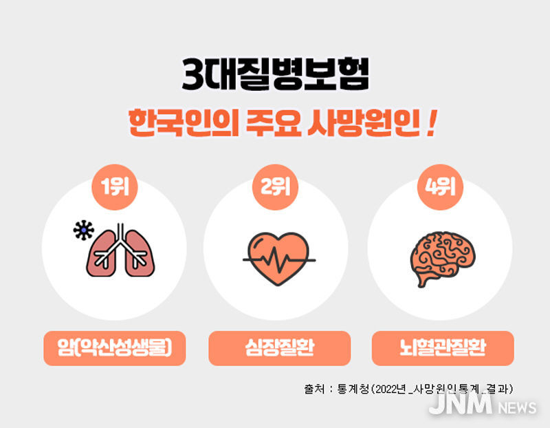 제이앤엠뉴스 | 3대질병으로 일컬어지는 암, 뇌혈관질환, 심혈관질환은 한국인의 주요 사망원인에서 상위를 차지하고 있으며, 이에 대한 진단비를 집중적으로 보장해 주는 보험상품을 3대질병진단비 보험이라 할 수 있다.