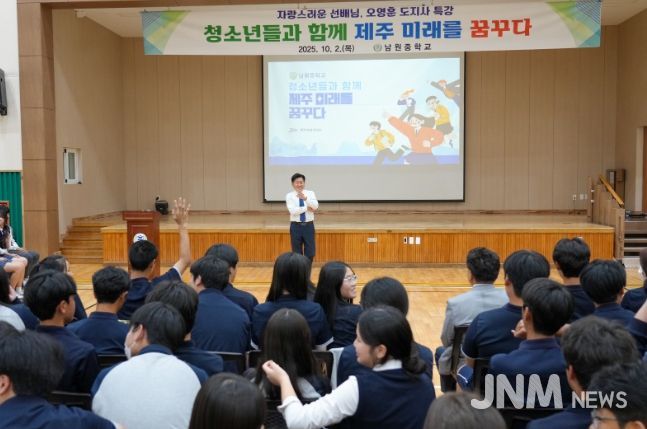 제이앤엠뉴스 | 오영훈 제주특별자치도지사는 2일 남원중학교(교장 오경석)를 찾아 전교생을 대상으로 특별강연을 열고, “남원과 제주를 넘어 아시아, 나아가 우주까지 여러분의 무대가 돼야 한다”며 청소년들의 꿈과 도전을 격려했다.