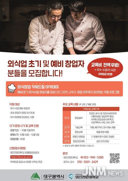 제이앤엠뉴스 | 대구광역시는 외식업 예비창업자와 초기 창업자의 안정적 정착을 지원하기 위해 외식창업 ‘키워드림’ 아카데미 13기 참가자를 10월 15일까지 모집한다.