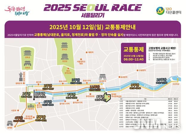 대회 당일인 12일 오전 6시부터 11시 40분까지 남대문로~을지로~청계천로 등 주요 구간별 교통이 통제된다. 다만 시는 대회 참가자 전원이 해당 통제 구간을 통과하면 순차적으로 통제를 해제해 시민 불편을 최소화할 예정이다.