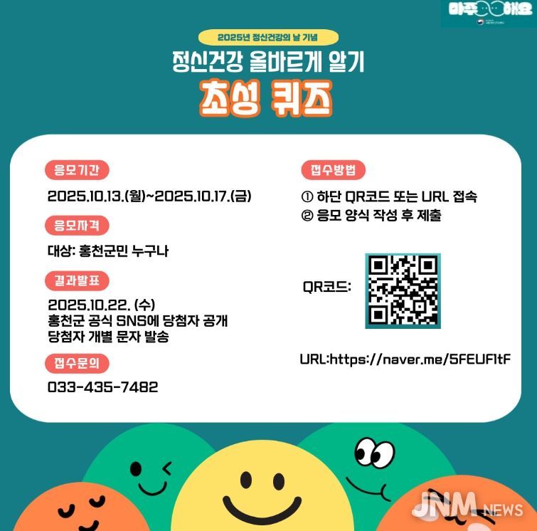 제이앤엠뉴스 | 홍천군은 10월 13일부터 정신건강의 중요성을 널리 알리고, 시민들의 올바른 인식개선을 위해 정신건강 인식개선 초성퀴즈 이벤트를 개최한다.