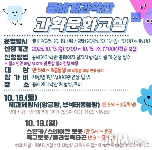 제이앤엠뉴스 | 영주시 콩세계과학관은 오는 18일부터 19일 양일간 어린이와 청소년을 대상으로 ‘과학문화교실’을 운영한다.