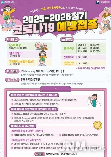 제이앤엠뉴스 | 달성군은 오는 10월 15일부터 2026년 4월 30일까지 ‘2025-2026절기 코로나19 예방접종’을 실시한다고 밝혔다.