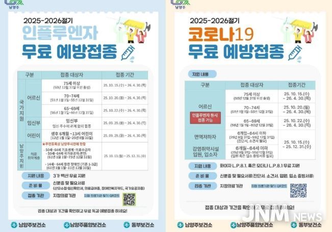 제이앤엠뉴스 | 남양주시는 9월 22일부터 내년 4월 30일까지 ‘2025-2026절기 코로나19·인플루엔자 예방접종 사업’을 추진한다고 밝혔다.