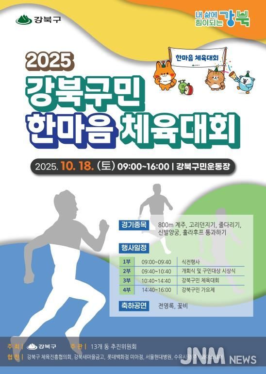 제이앤엠뉴스 | 강북구는 오는 10월 18일 오전 9시 강북구민운동장에서 ‘2025 강북구민 한마음 체육대회’를 개최한다고 밝혔다.