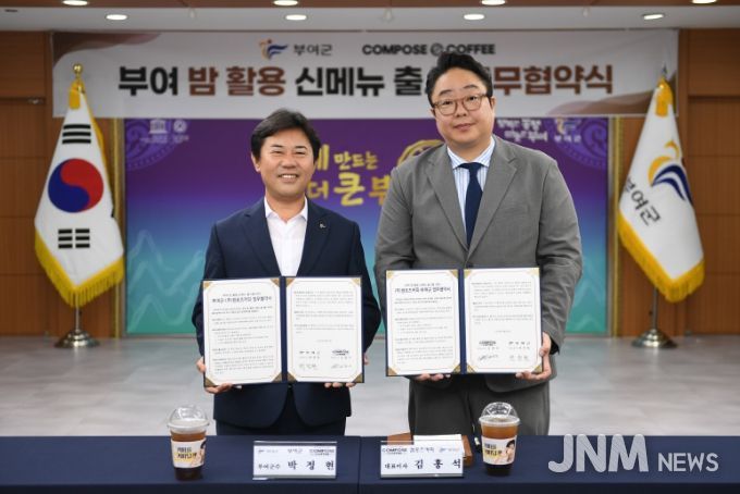 이번 협약에 따라 부여군은 지역 농특산물의 우수성을 알리며, 지역 브랜드 가치를 향상하고, 컴포즈커피는 부여 밤을 원재료로 활용한 신메뉴를 새롭게 선보인다.