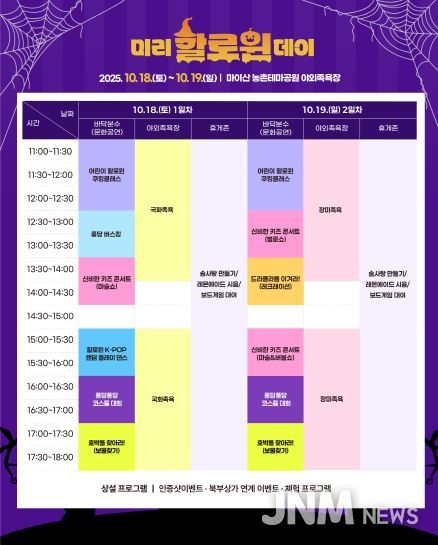 마이산 북부 야외족욕장에서는 매월 새로운 주제로 다양한 이벤트를 선보이고 있으며 이번 10월 특별 행사는 할로윈 데이를 주제로 △할로윈 코스튬 대회 △어린이 쿠킹클래스 △신비한 키즈 콘서트(마술&버블쇼) △할로윈 타로체험 등 다채로운 프로그램이 마련된다. 행사는 양일간 오전 11시부터 오후 6시까지 진행되며 일부 행사는 SNS 등을 활용해 사전 신청을 받아 운영된다.