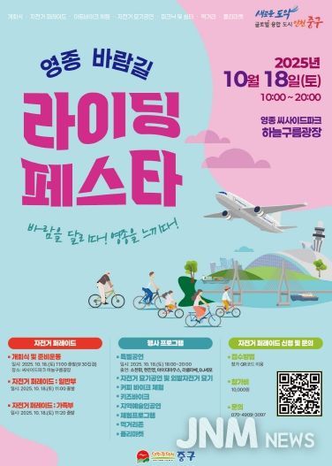 김정헌 중구청장은 “영종국제도시는 바다와 하늘이 만나 뛰어난 풍광을 자랑한다는 점에서 자전거 나들이로 탁월한 명소”라며 “올가을, 많은 시민이 영종 바람길 라이딩 페스타에서 특별한 추억을 쌓길 바란다”라고 밝혔다.