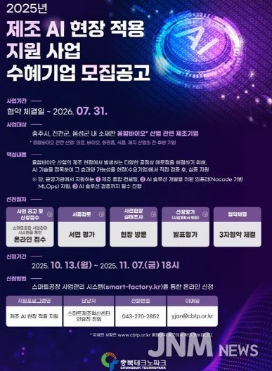 제이앤엠뉴스 | 충북도는 오는 11월 7일까지 도내 주력산업인 융합바이오 산업과 인공지능(AI) 기술의 융합 촉진을 위한 ‘제조 AI 현장 적용 지원사업’의 참여기업을 모집한다고 14일 밝혔다.