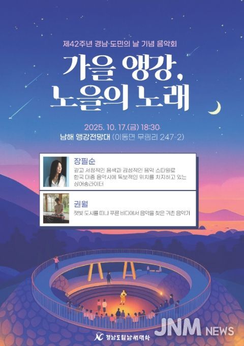 제이앤엠뉴스 | 경남도립남해대학은 17일 저녁 6시 30분, 남해 앵강전망대에서 지역민과 함께하는 가을음악회 ‘가을 앵강, 노을의 노래’를 개최한다.