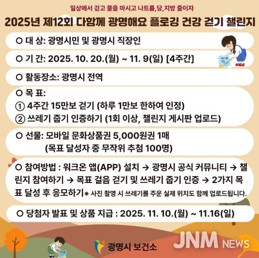 제이앤엠뉴스 | 광명시 보건소는 오는 20일부터 11월 9일까지 4주간 ‘제12회 다함께 광명해요! 플로깅 건강 걷기 챌린지’를 운영한다.