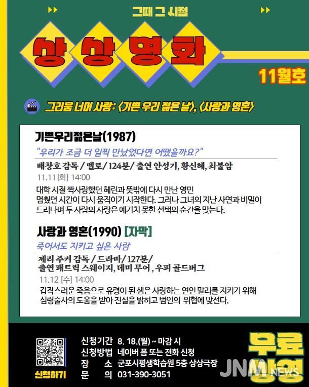 제이앤엠뉴스 | 군포문화재단 군포시평생학습원 상상극장은 오는 11월 11일과 12일 고전영화 상영 프로그램 ‘상상명화’를 운영한다. ‘그리움 너머 사랑’을 주제로 〈기쁜 우리 젊은 날〉과 〈사랑과 영혼〉을 상영한다.
