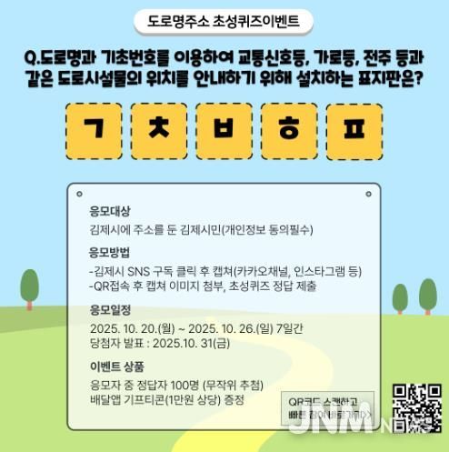 제이앤엠뉴스 | 김제시는 도로명주소에 대한 시민들의 관심과 이해를 높이고 올바른 주소 사용을 장려하기 위해 오는 20일부터 26일까지 도로명주소 초성퀴즈 이벤트를 실시한다고 밝혔다.