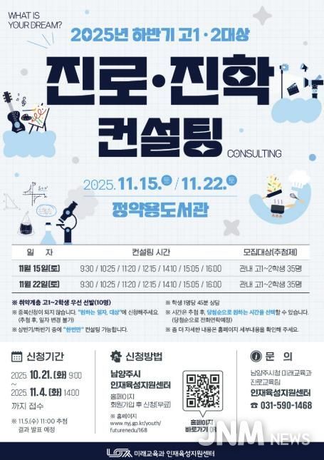 제이앤엠뉴스 | 남양주시는 오는 21일부터 ‘2025년 하반기 진로·진학 컨설팅’참가자를 모집한다고 밝혔다.