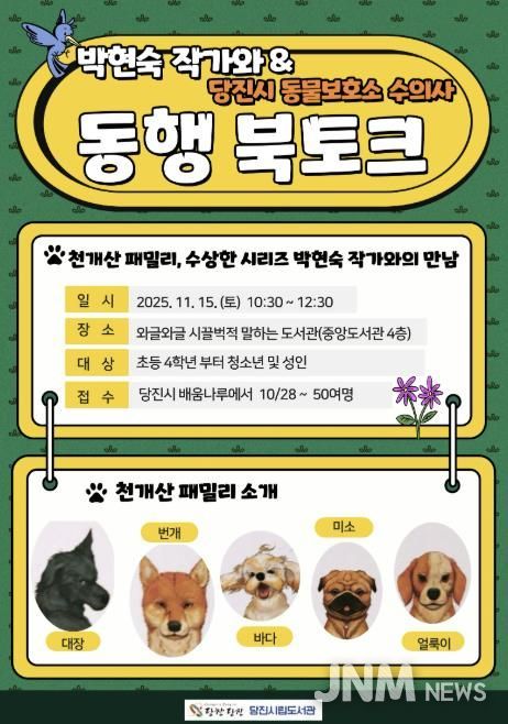 제이앤엠뉴스 | 당진시립중앙도서관은 오는 11월 15일 중앙도서관 4층 와글와글 시끌벅적 말하는 도서관에서 청소년과 성인 50여 명을 대상으로 오감만족 말하는 공연 ‘동행 북토크’를 운영한다고 24일 밝혔다.