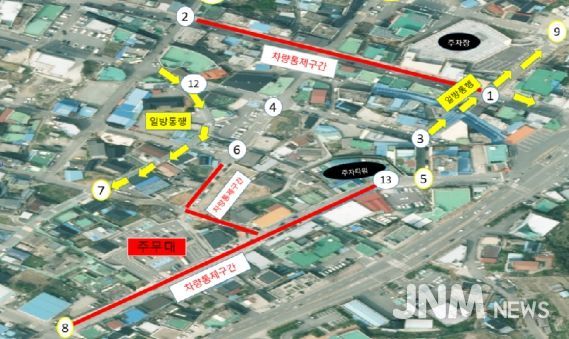 전면 통제 구간은 농협중앙회 무안군지부 ~ 용산식당 구간과 낙지골 주차타워 ~ LG 베스트샵 구간, 도시재생주차장 ~ 카페 머울다 사이 3개 구간이며, 일방통행 구간은 뻘낙지거리(골목) 주차 타워 ~ 농협중앙회 골목 구간과 안창장어 ~ 행운건강원 사이 2개 구간이다.