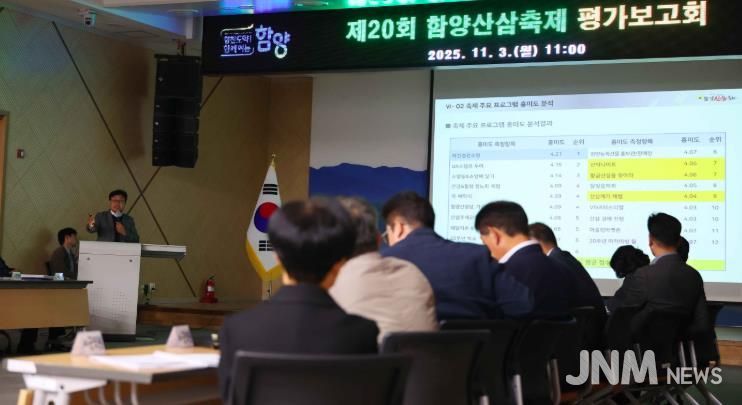 제이앤엠뉴스 | 함양군은 11월 3일 군청 대회의실에서 진병영 군수를 비롯한 이현재 산삼축제위원장, 축제 위원, 군의원, 부서장 등 70여 명이 참석한 가운데 ‘2025년 제20회 함양산삼축제 평가보고회’를 개최했다.