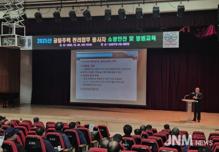 제이앤엠뉴스 | 인천시 남동구는 최근 구청 대강당에서 의무관리대상 공동주택 관리업무 종사자를 대상으로 2025년 공동주택 소방안전 및 방범 교육을 했다고 4일 밝혔다.