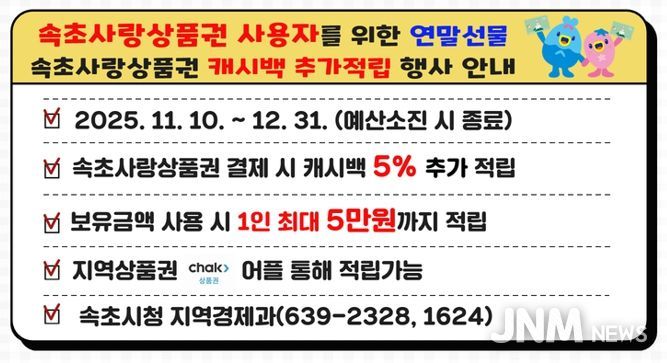 이에 따라 11월 10일부터 속초사랑상품권 사용 시 결제금액의 5%를 캐시백으로 적립하는 추가 행사를 진행한다. 적립 한도는 1인당 최대 5만 원이며, 행사는 오는 12월까지 진행되며 예산 소진 시 종료된다.