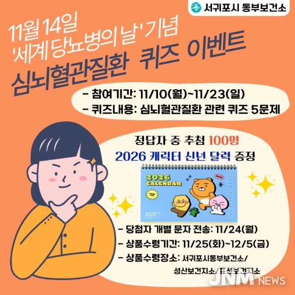 제이앤엠뉴스 | 서귀포시 동부보건소는 2025년 ‘세계 당뇨병의 날’을 기념하여 11월 10일부터 11월 23일까지 14일간 모바일 앱 ‘워크온’을 활용한 심뇌혈관질환 퀴즈 이벤트를 운영한다.