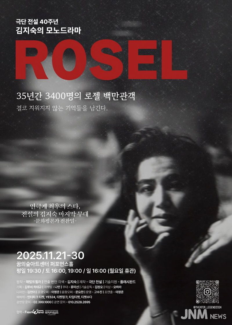 제이앤엠뉴스 | 극단 전설 40주년 기념작이자 배우 김지숙의 마지막 공연인 모노드라마 〈로젤〉이 오는 11월 21일부터 30일까지 꿈의숲아트센터 퍼포먼스홀에서 막을 올린다. 35년간 3,400회 이상 공연되며 백만 명이 넘는 관객을 울린 이 작품은 여성의 주체성과 인간성의 회복을 그린 한국 연극사의 대표작으로 꼽힌다.