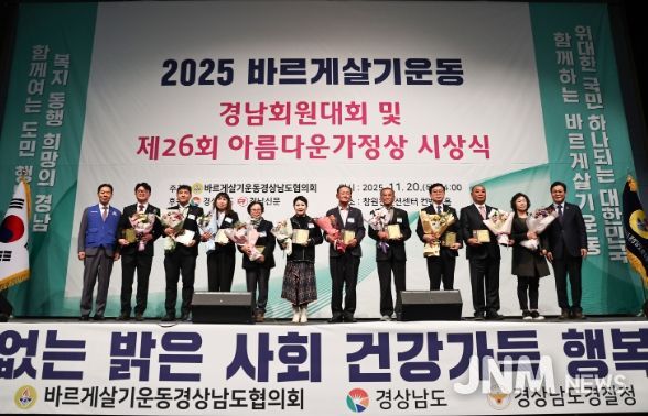 제이앤엠뉴스 | 경상남도가 20일 창원컨벤션센터에서 열린 ‘2025 바르게살기운동 경남 회원대회 및 제26회 아름다운 가정상 시상식’에서 지역사회 봉사에 앞장서 온 회원들을 격려했다.