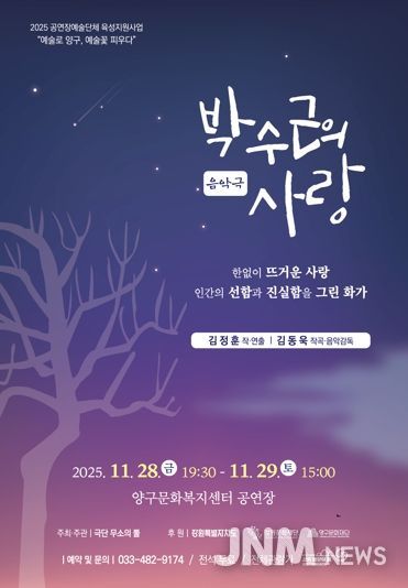 제이앤엠뉴스 | 양구문화재단은 강원문화재단과 함께 양구의 대표 화가 박수근 화백의 사랑과 일대기를 그린 음악극 ‘박수근의 사랑’을 오는 11월 28일(19:30), 29일(15:00) 양일에 걸쳐 양구문화복지센터 공연장에서 선보인다. 본 공연은 극단 ‘무소의 뿔’이 주최·주관한다.