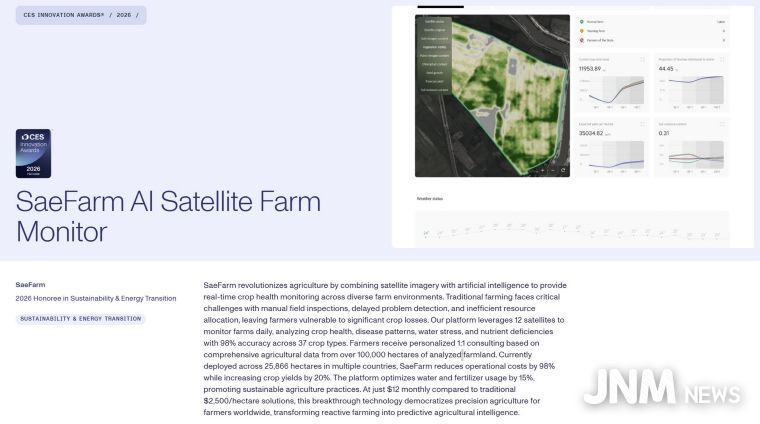 제이앤엠뉴스 | 경기도농업기술원과 연천군, 주식회사 새팜이 공동으로 추진한 ‘농림위성 영상 AI 분석기술 활용 생산단지 의사결정시스템’이 세계적 기술 전시회 ‘CES(세스) 2026’ 개최를 앞두고 혁신상을 수상했다.