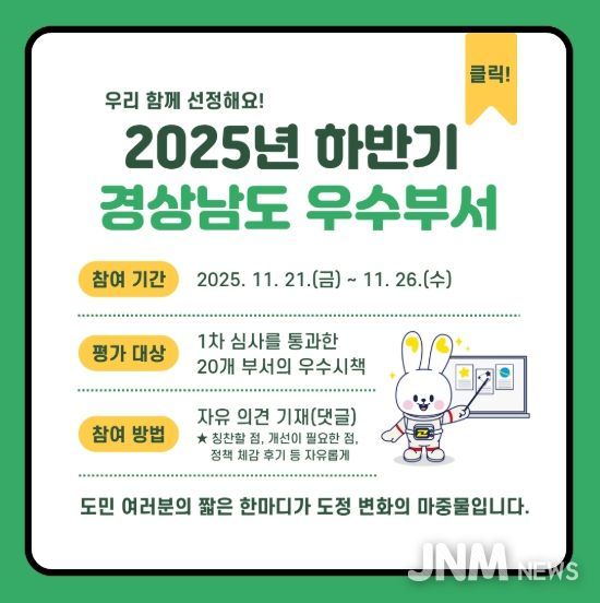 제이앤엠뉴스 | 경상남도가 ‘2025년 하반기 도정업무 실적 우수부서’ 선정을 위해 오는 26일까지 도민 의견을 받는다.