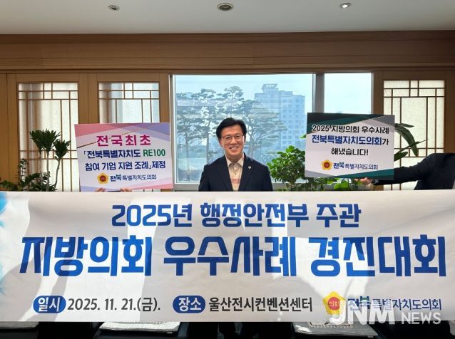 제이앤엠뉴스 | 전북특별자치도의회가 지난 21일 울산전시컨벤션센터에서 열린 행정안전부 주관 ‘2025년 지방의회 우수사례 경진대회’에서 본선에 진출해 수상하는 영예를 안았다.