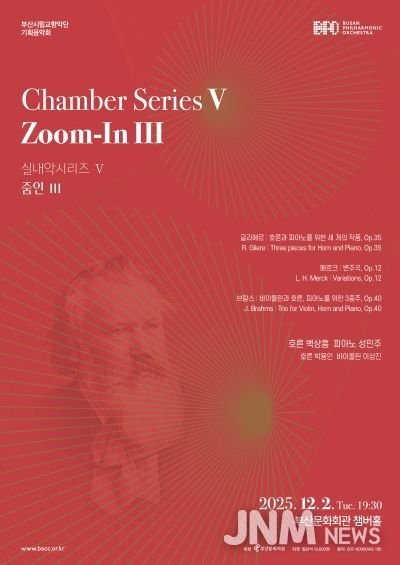 제이앤엠뉴스 | 부산시립교향악단(수석객원지휘자 홍석원)의 실내악 시리즈 '줌인'의 세 번째 무대가 오는 12월 2일 부산문화회관 챔버홀 무대에 오른다.