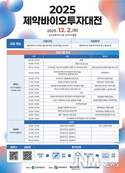 제이앤엠뉴스 | 인천광역시가 주최하고 인천관광공사와 KOTRA, 한국제약바이오협회가 공동 주관하는 ‘제약바이오투자대전’이 오는 12월 2일 인천 송도컨벤시아 프리미어볼룸에서 열린다.