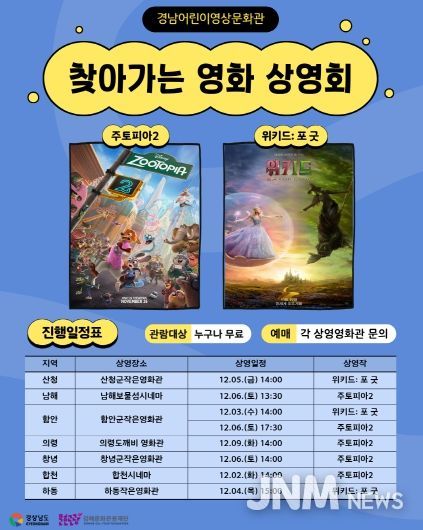 제이앤엠뉴스 | 경남어린이영상문화관이 오는 12월 2일부터 9일까지 경상남도 7개 시군에서 찾아가는 영화상영회를 개최한다.