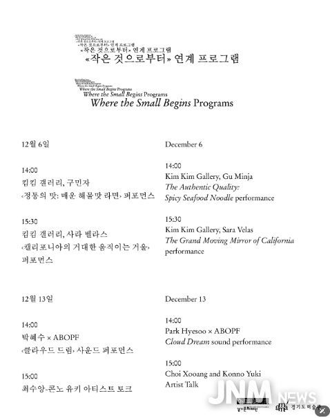 제이앤엠뉴스 | 경기문화재단 경기도미술관(관장 전승보)은 현재 진행 중인 2025 경기작가집중조명 《작은 것으로부터》(2025.11.19.-2026.2.22.) 전시와 연계하여 12월 6일과 13일 양일간 연계 프로그램을 개최한다. 전시 참여 작가 김나영 & 그레고리 마스, 박혜수, 최수앙의 작업 세계를 보다 심층적으로 이해할 수 있는 이번 프로그램은 퍼포먼스와 아티스트 토크의 형식으로 관람객과 소통을 확장한다.